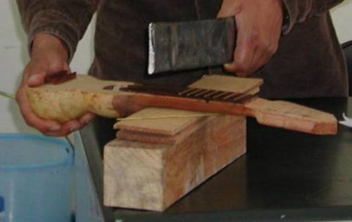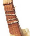ENTRASTADOS METÁLICOS Actualmente se entrasta con unas tiras metálicas de latón o de aleación níquel y plata, las cuales tienen una sección en forma de "T", con un domo en la parte superior y en la inferior una pata con salientes que les permiten aferrarse a la madera del diapasón. La colocación de los trastes, consiste en cortarlos al tamaño aproximado del ancho del diapasón, hacer una ranura perpendicular de 1.5 a 2 mm de profundidad en éste (para lo cual debe buscarse una sierra del grueso requerido ) y proceder a clavarlos. Para esto se coloca el trozo de tira de traste y se embute a golpes, se pude usar un martillo o mazo, pero en ocasiones se clava de un lado y se saca del otro. Una barra rectangular permite introducir parejo el traste en toda su longitud. Obviamente no se puede golpear directamente apoyados en la caja del instrumento, es necesario apoyar el mástil sobre un bloque de madera, protegido por tiras de hule, corcho o varias capas de una tela dura (mezclilla). Finalmente con una lima de rematan los extremos del traste de manera que no lastime las manos al usar el instrumento. ![]() Figura 8. Entrastado metálico de una Concha. BIBLIOGRAFIA Y OTRAS FUENTES